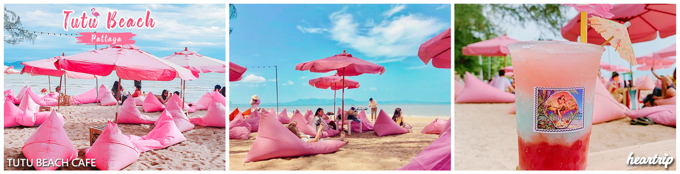 【Tutu Beach】這裡是芭達雅最火紅的網美打卡咖啡廳~~來到芭達雅怎能不去海灘呢!這裡的沙灘吸引人的地方就是可以躺在粉紅懶人靠墊,搭配粉紅洋傘,點上一杯飲品,放空曬太陽,是屬於最慢活的生活方式了!